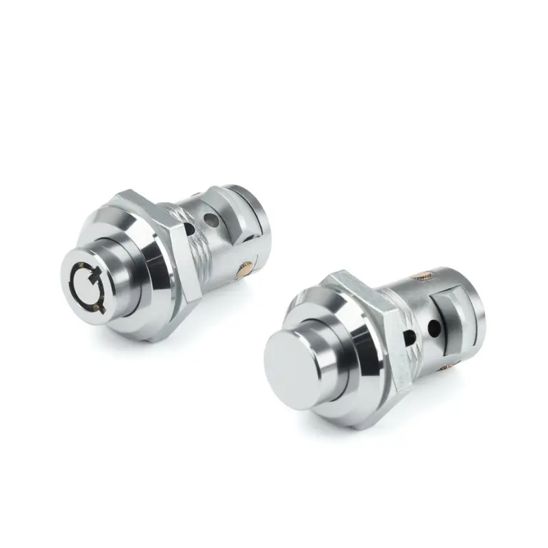 El modelo con botón se desbloquea automáticamente cuando se presiona el botón y se bloquea cuando la puerta está cerrada, brindando protección de seguridad básica. El modelo con cerradura de pasador utiliza un mecanismo de pasador que solo permite la rotación con una llave correspondiente, lo que brinda funcionalidad antirrobo. Ambos modelos utilizan una construcción de aleación de zinc para ofrecer un cierto nivel de resistencia y cuentan con juntas impermeables adicionales para mayor practicidad. La cerradura cilíndrica de aleación de zinc de la máquina expendedora tiene un acabado cromado brillante para resistir la corrosión. El espesor máximo de los paneles de las puertas instalados es de 10 mm. (Para materiales de acero inoxidable, contáctenos. Actualmente estamos fabricando los moldes).